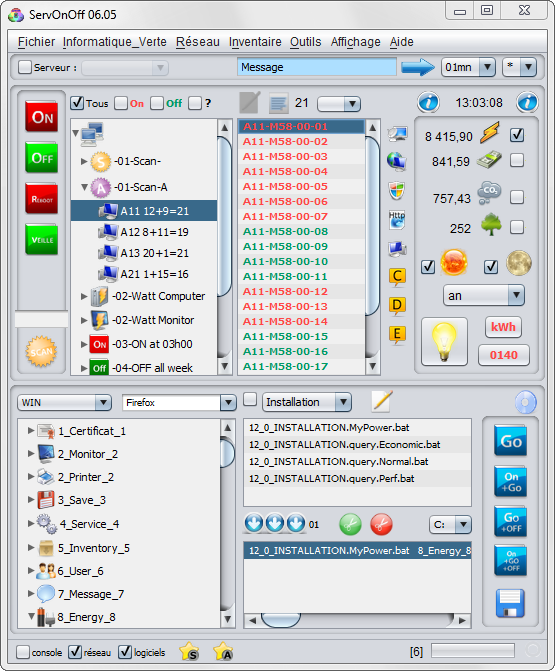 Ce logiciel diminue ce coût en gérant les arrêts, nocturnes et de week-end, des ordinateurs insomniaques. Nous appelons "ordinateur insomniaque" un ordinateur tournant 24 heures sur 24 et 7 jours sur 7. Sachant que ses heures d'utilisation réelle sont plutôt de 10 heures par jour et de 5 jours par semaine. Remarque : Une trentaine d'ordinateurs insomniaques émettent autant de CO2 qu'une voiture standard : soit environ 1,8 Tonnes de CO2 par an, pour un coût de 1300€ TTC.