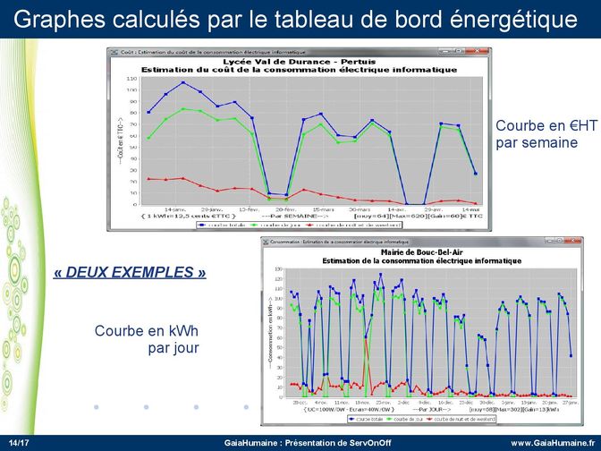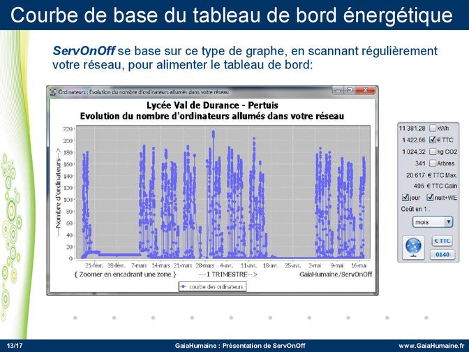 Notre logiciel ServOnOff propose un tableau de bord énergétique basé sur une estimation de la consommation électrique moyenne de votre parc informatique. Son objectif est de donner un ordre de grandeur aux différentes notions liées à cette consommation d'énergie. Il permet également de communiquer des informations graphiques énergétiques, au sein de votre organisation, afin de sensibiliser chaque personne sur cet enjeu primordial...