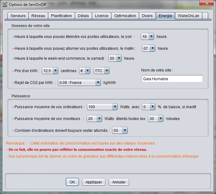 Notre logiciel ServOnOff propose un ensemble de paramètres modifiable selon votre site :